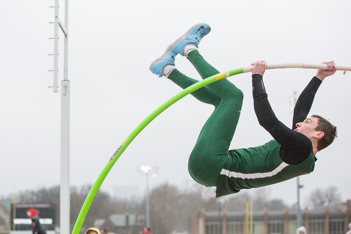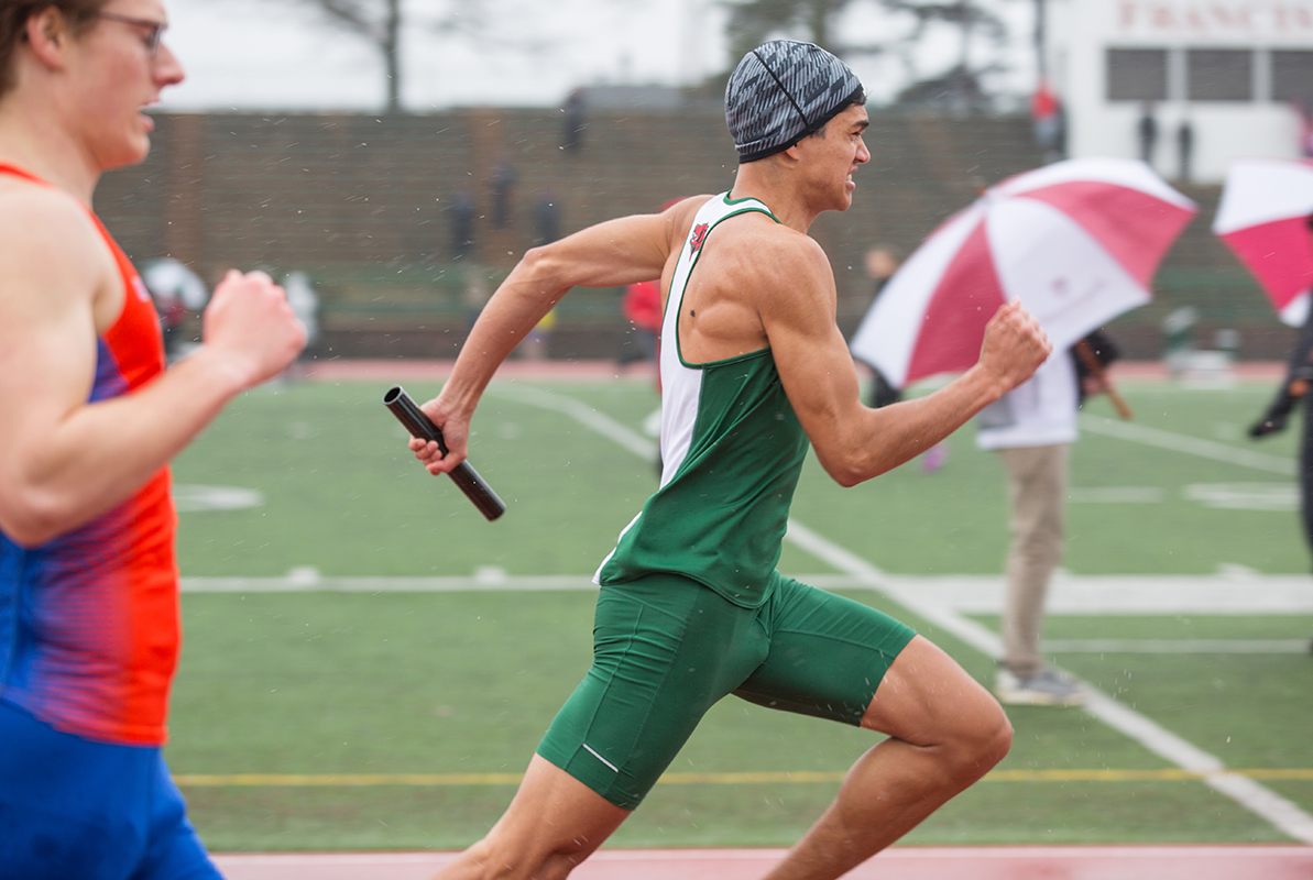 Bruton captured junior John Harry Wagner as he powered through the 4×100-meter relay at the WashU Invite in March 2019. Bruton shoots 400 to 800 photos per event.
