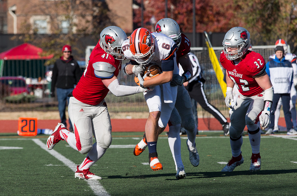 Linebacker Jake Coon and defensive back Jeff Marek tackled the Carroll University ball carrier to close the 2018 season.
