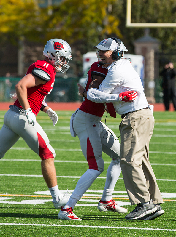 Bruton captured coach Larry Kindbom hugging junior defensive back Andrew Whitaker after Whitaker caught an interception against Augustana College on Nov. 2, 2019. Kindbom retired this year after 31 seasons as Bears head coach. “I really enjoyed covering him and his teams. He really had a special relationship with his players,” Bruton said.