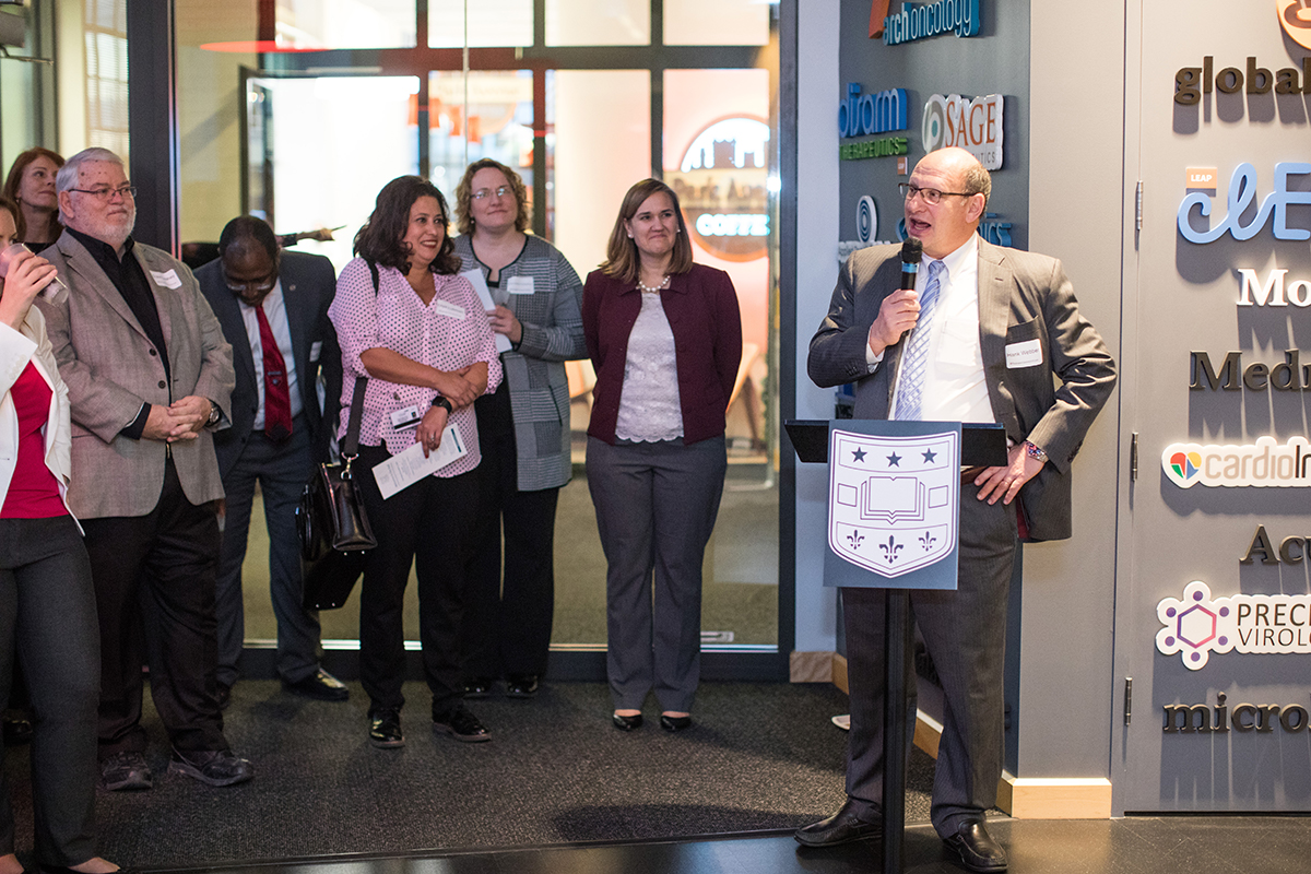 Henry Webber, the university’s executive vice chancellor, speaks during the Office of Technology Management’s annual “Welcome to the Wall” event Dec. 5. More than 150 people attended to celebrate the seven new startups spun out of Washington University tech and research this year. Also at the event, the Skandalaris Center announced its winners for the LEAP fall cycle. (Photo: Jenn Korman)