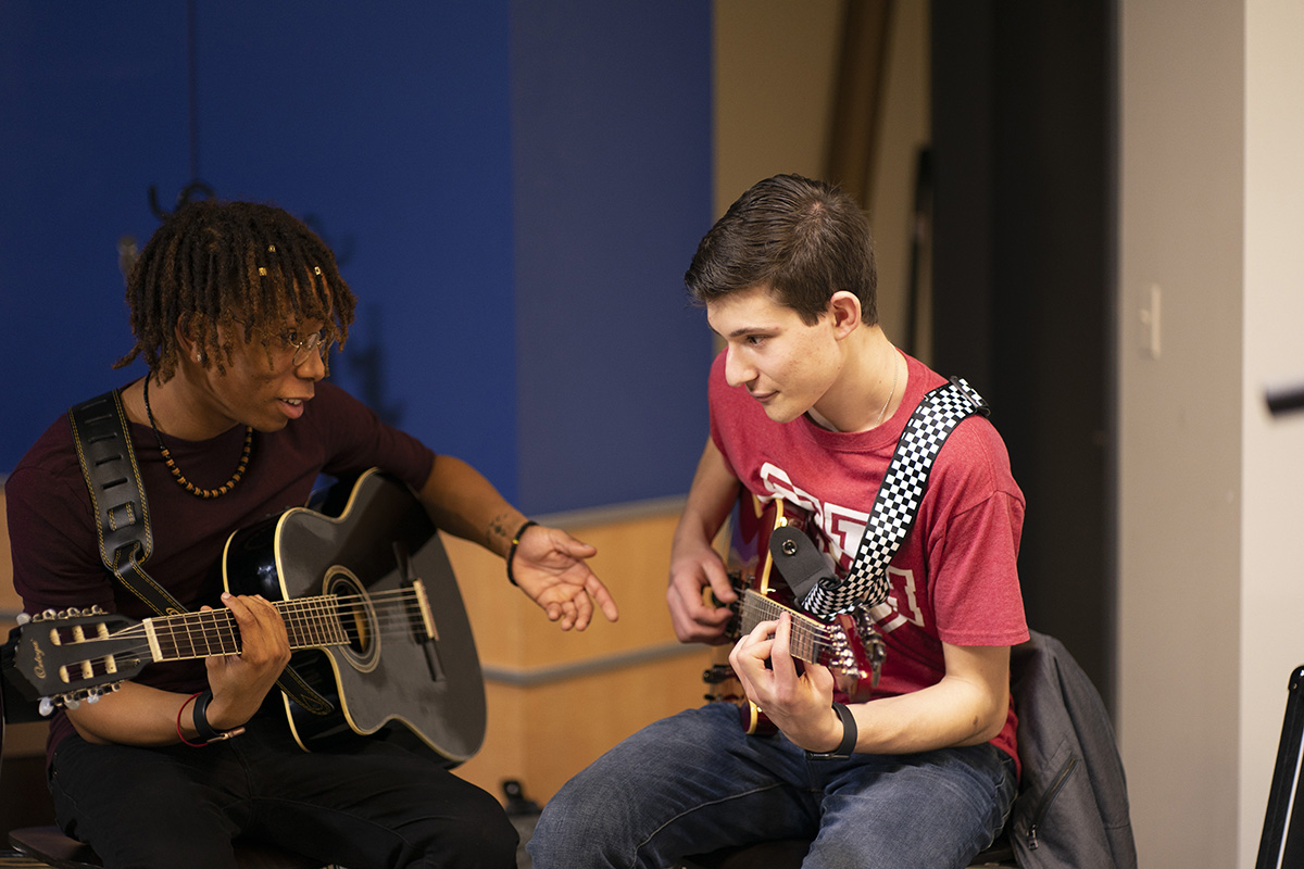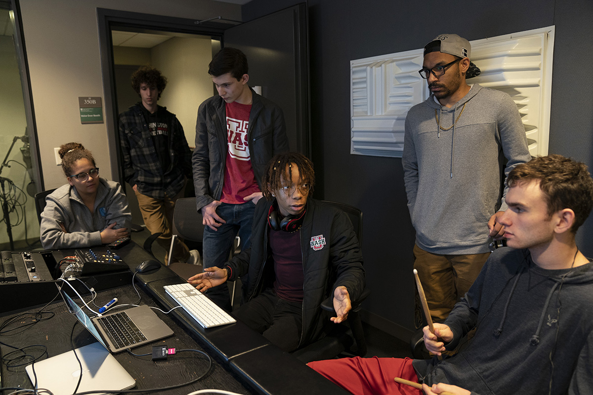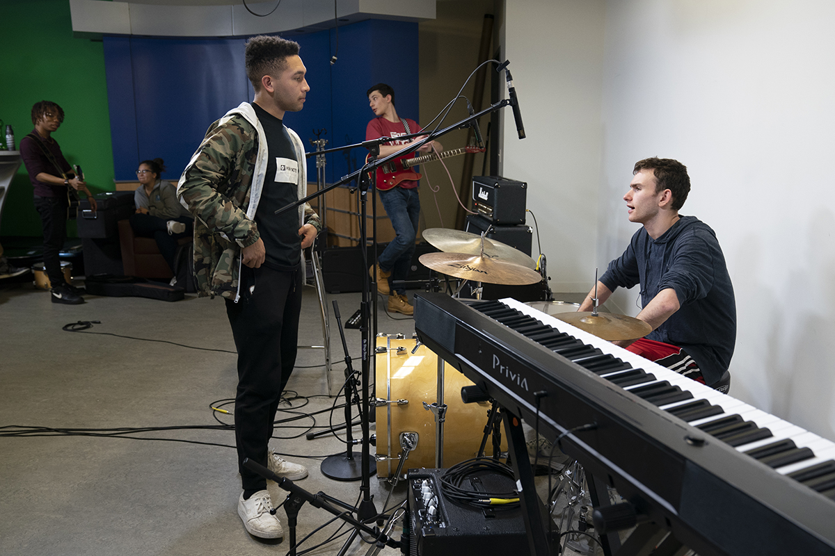 Enter Jordan. He had booked the Harvey Media Center’s state-of-the-art recording studio for High Note’s Song Week, an event for students to record, network and participate in workshops. Jordan then connected Bridges to first-year students Ethan Harris, a drummer; and Coby Schneider, a guitarist with recording experience. Along with Bridges’ manager, Anthony Bartley, and Harvey Media Center manager Jeff Allen, the team recorded the song in a day.