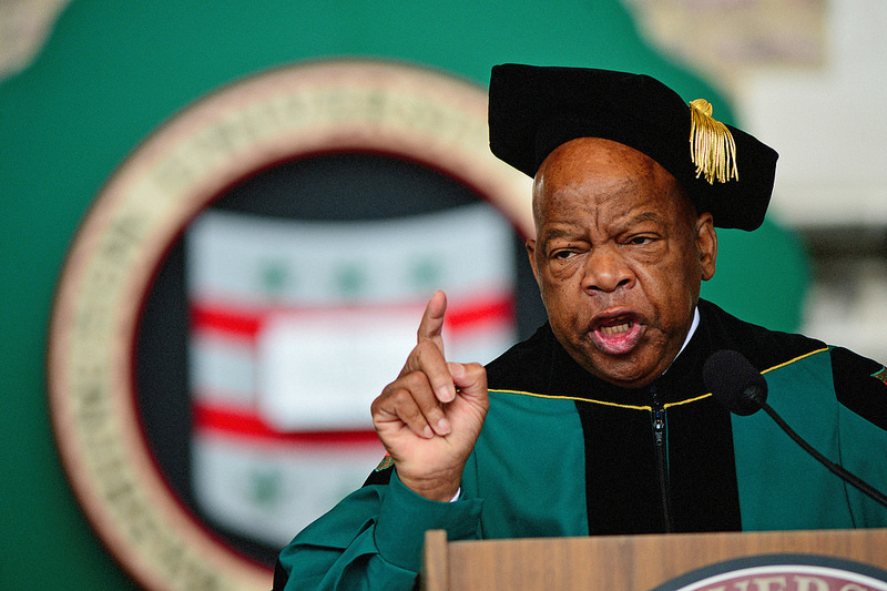 “You must leave here and get in the way,” Lewis said. “When you see something that is not fair, not right, not just, you must have the courage to stand up, to speak up and find a way to get in the way.”