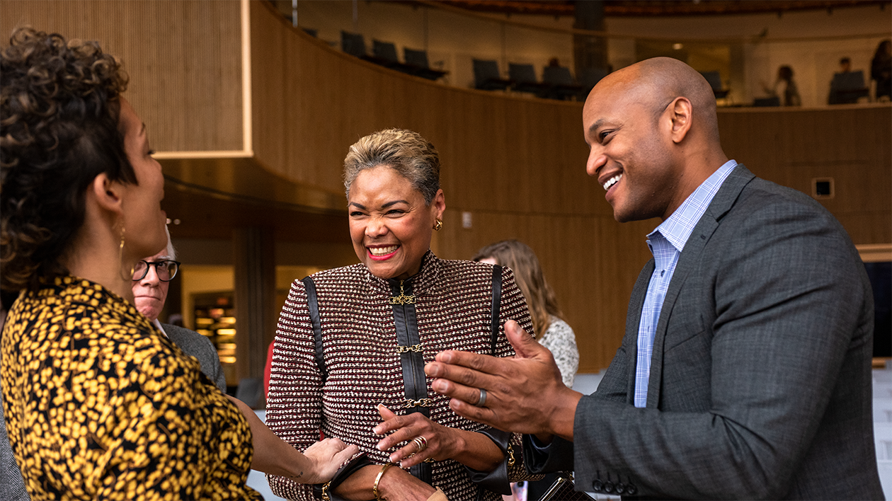 Wes Moore (right) visits with Samantha Tweedy (left) of Robin Hood, an antipoverty organization, and Mary Elizabeth Grimes, president of Marian Middle School, following the discussion on “Poverty and Race: The Other St. Louis” Jan. 27 in Hillman Hall. (Photo: Carol Green/Washington University)