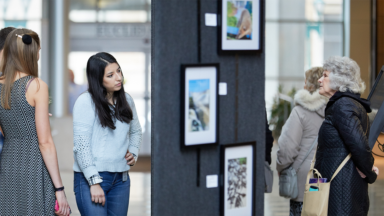 Thomas Van Horn and Nimansha Jain (right) explore the exhibits Jan. 30 at the Annual Art Show at the Farrell Learning and Teaching Center on the Medical Campus. (Photo: Matt Miller/School of Medicine)