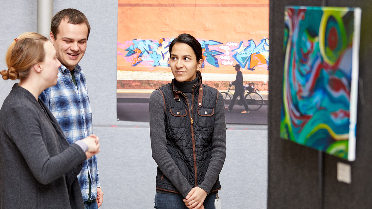 Students Anna Dowling (left) and Kristen Lineback (center) take in the Annual Art Show Jan. 30 at the Farrell Learning and Teaching Center on the Medical Campus. (Photo: Matt Miller/School of Medicine)