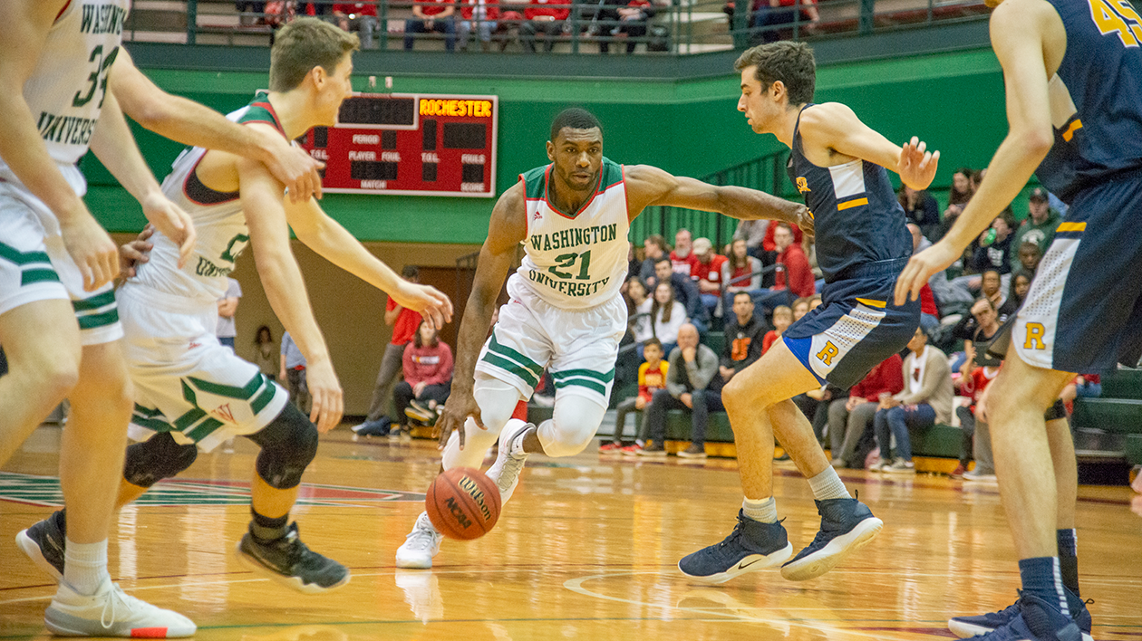Senior DeVaughn Rucker takes the ball down the court Jan. 31, Eliot Society Family Night, at the men’s basketball game against Rochester at the Field House. The Bears won 76-66. (Photo: Danny Reise/Washington University)