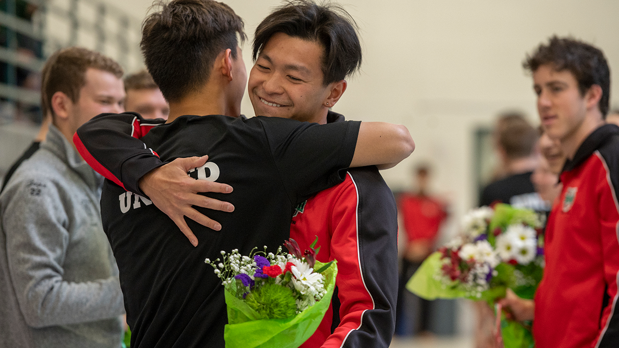 Senior members of the Washington University swimming and diving team embrace Jan. 18 before the senior day meet against Truman State at Millstone Pool. (Photo: Danny Reise/Washington University)