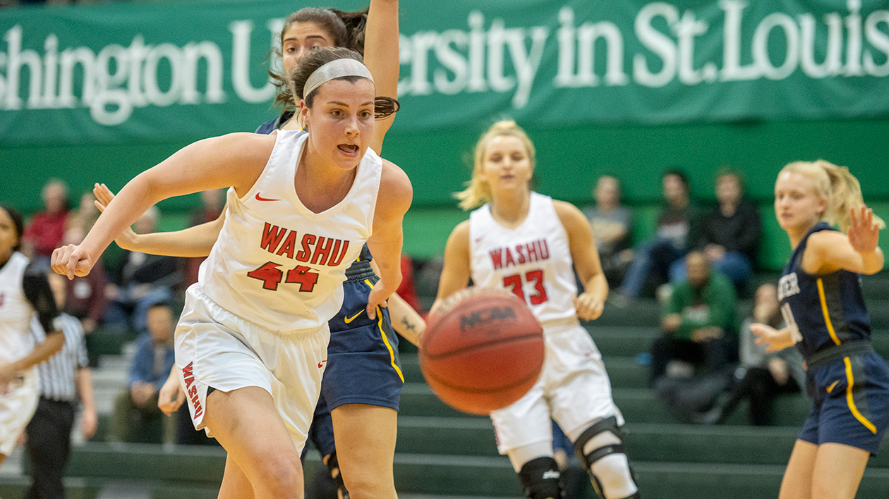 Senior Kristina Schmelter makes a play Jan. 31 during a game against Rochester at the Field House. The Bears won 79-67.(Photo: Danny Reise/Washington University)