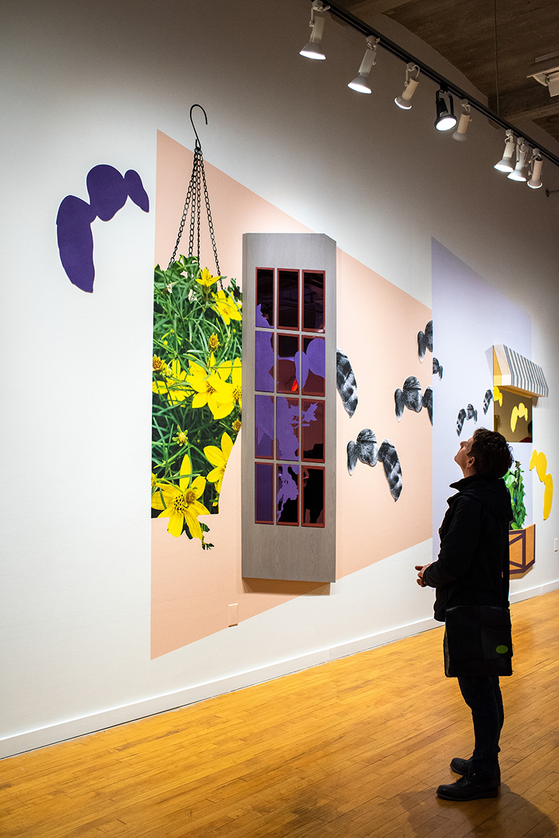 Jennifer Colten, senior lecturer at the Sam Fox School, views the artwork “Bee Line” at the “Body Scrn Meme” exhibition opening reception Feb. 7 at the Des Lee Gallery. (Photo: Carol Green/Washington University)