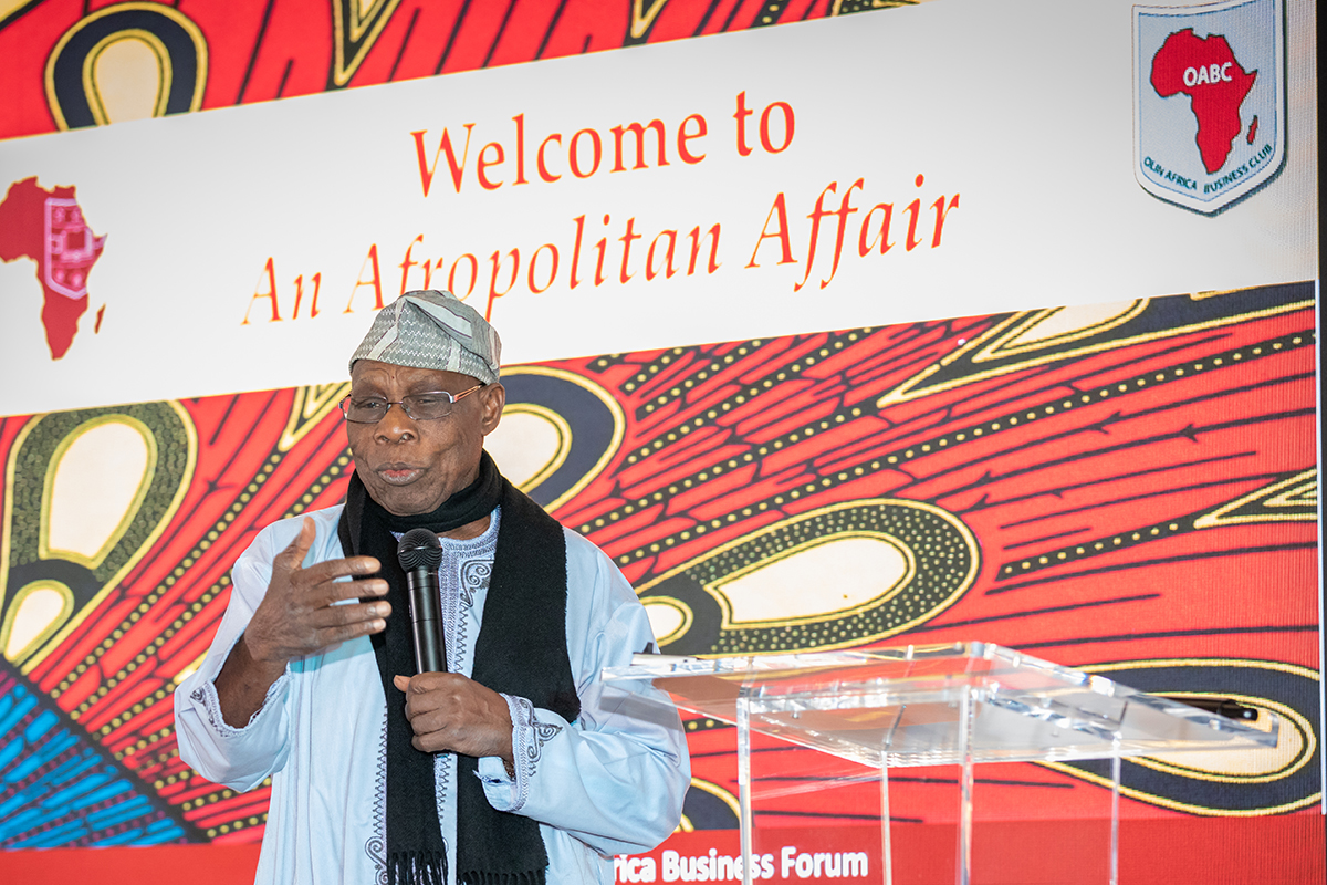 Olusegun Obasanjo, former leader of Nigeria, speaks Feb. 6 at the Africa Business Forum opening gala at Cortex Innovation Hall. (Photo: Olin Business School)