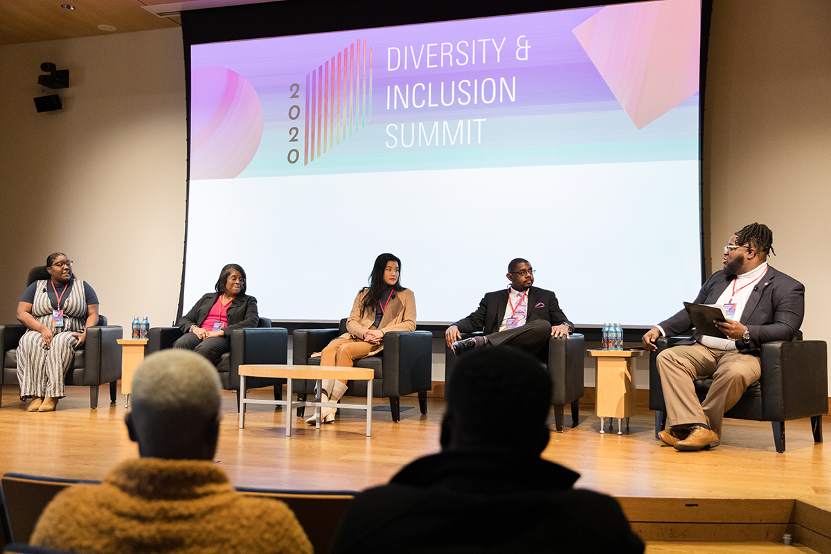 The Diversity & Inclusion Summit, hosted by Olin Business School fraternities, took place Feb. 7. The keynote panel included (from left) Dasha Kennedy, of the Broke Black Girl, Valerie Patton, of the St. Louis Diversity & Inclusion Initiative, Diana Zeng a 2014 Olin alumna, and artist and activist