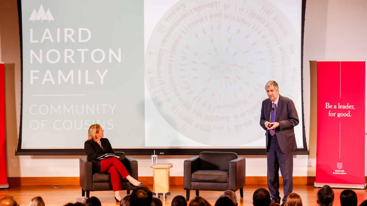 Julie Lilly, CEO of St. Louis Trust Company (left), and Jeff Vincent, president and CEO of Laird Norton Company, answer questions Jan. 28 at the 5th Annual Family Business Symposium at Emerson Auditorium. (Photo: Molly Cruitt/Washington University)