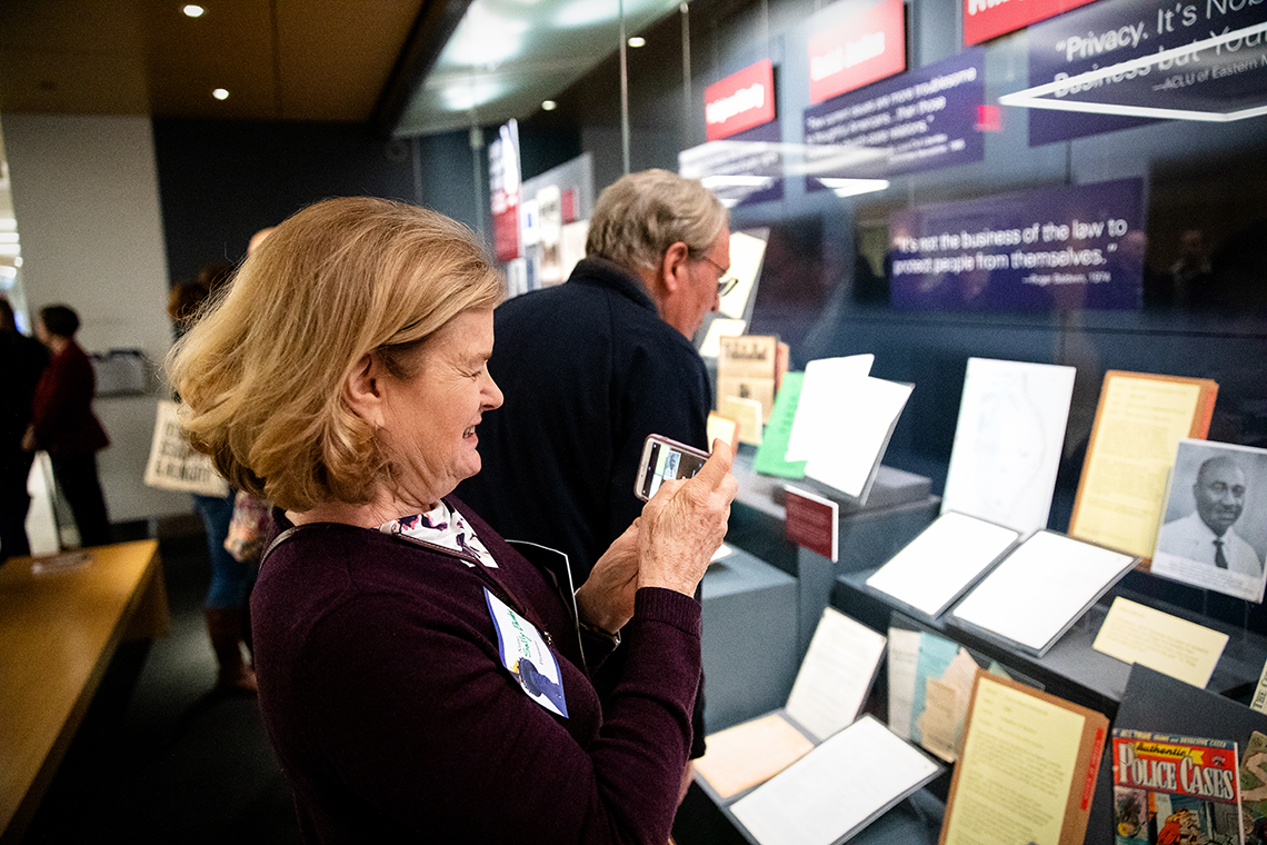 Visitors view artifacts at the Jan. 12 opening of the University Libraries exhibit “Liberty and Justice for All: ACLU of Missouri, 1920-2020.” (Photo: University Libraries)
