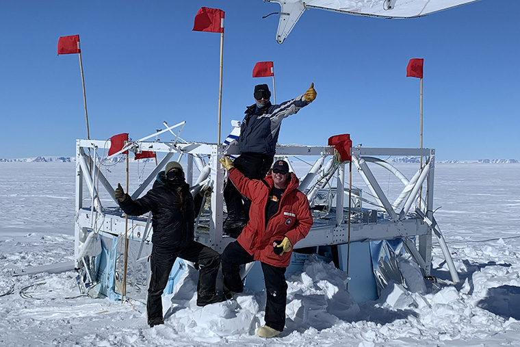 Brian Rauch, research assistant professor of physics in Arts & Sciences and the university’s principal investigator for SuperTIGER (right), at the instrument recovery site in Antarctica. Rauch and his team conducted research over a period of 32 days starting Dec. 15. In the photo, he is joined by contractor Kaija Webster and Scott Battaion with the NASA/Columbia Scientific Balloon Facility. (Photo: SuperTIGER team)