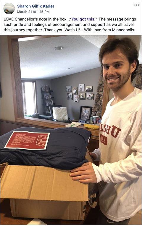 Last week, volunteers and residential life staff worked off of forms filled out by students listing what they needed and where it could be found. Once the box was packed, movers added a note from Martin encouraging students to be well and to keep their WashU spirit.