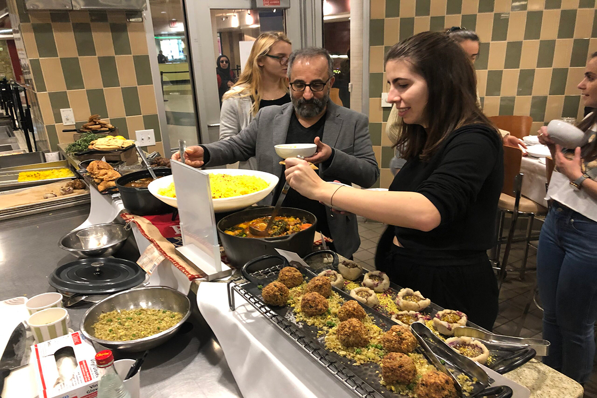 Students of Hayrettin Yücesoy, associate professor of Arabic and Islamic studies in Arts & Sciences, collaborated with Dining Services chef Tom Martoccio to prepare a medieval menu of goat stew with mint, pistachio empanadas, beef meatballs and saffron rice. Yücesoy (left) teaches “Of Dishes, Taste and Class: History of Food in the Middle East.” (Photo courtesy of Bon Appetit)