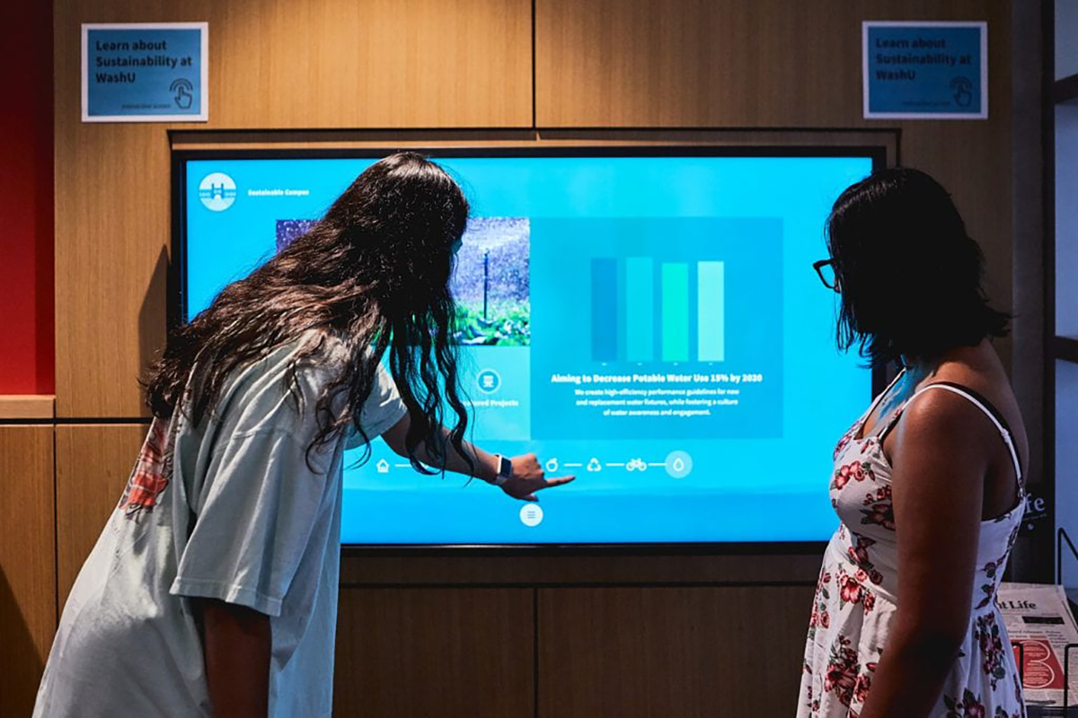 Washington University students explore the new sustainability dashboard last fall in Whispers Café at Olin Library. A new initiative of the Office of Sustainability, the sustainability dashboards, which are also in Schnuck Pavilion, offer a fun, interactive way for users to learn more about sustainability on campus. (Photo courtesy of Office of Sustainability)