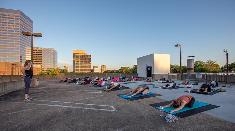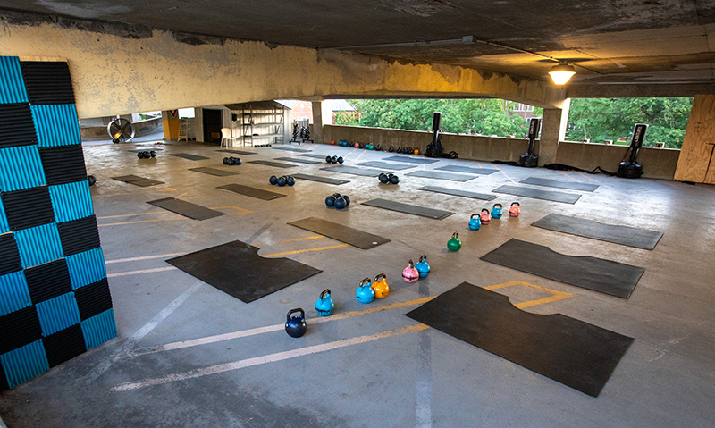 The classes are located on the top levels of the garage and the roof, space that is currently unused while university staff continue to work remotely. TruFusion has installed sanitation stations and implemented numerous safety protocols, including temperature checks and social distancing.