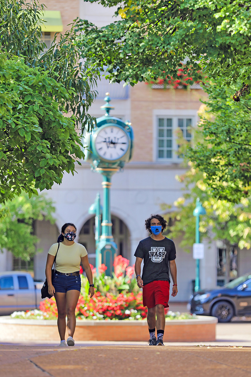 Students walk past the clock tower on the South 40 on Sept. 14, the first day of the fall semester. (Photo: James Byard/Washington University)