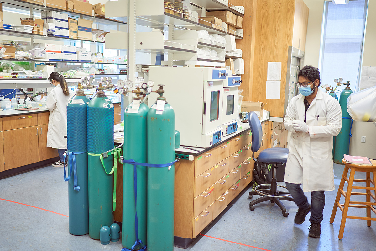 Graduate students Jinshu Yan (left) and Kaushik Mitra work under COVID-19 safety guidelines Sept. 10 in Jeff Catalano’s aqueous geochemistry and mineralogy lab. (Photo: Devon Hill/Washington University)