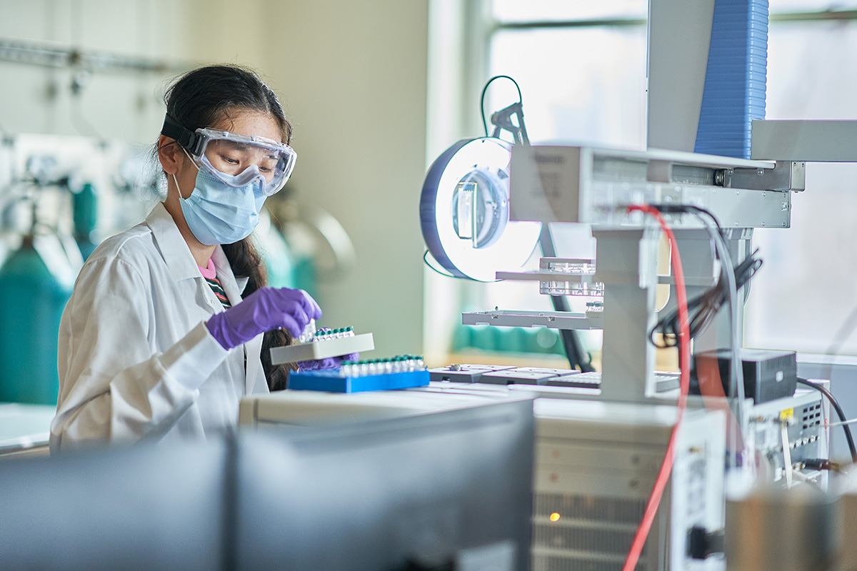 Graduate student Nadia Sae-Lim conducts research amid COVID-19 safety guidelines Sept. 10 in Bronwen Konecky’s climate and paleoclimate laboratory in Arts & Sciences. (Photo: Devon Hill/Washington University)