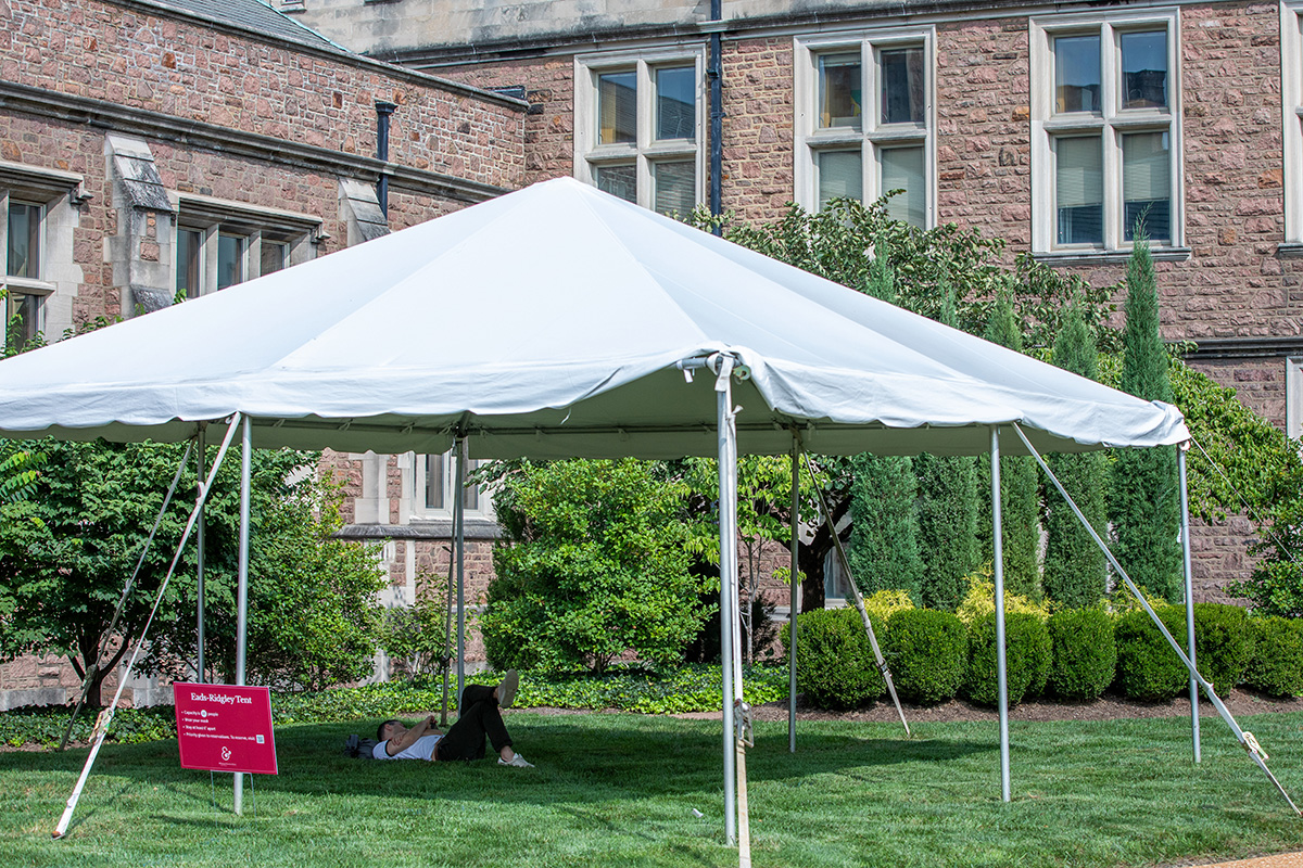 Senior Daniel Kanef takes a break in the tent outside Eads and Ridgley halls before heading to class Sept. 14. (Photo: Joe Angeles/Washington University)