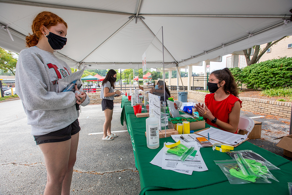 Sophomore Bridget McGinn stops at the check-in table on West Campus ahead of taking a COVID-19 test and moving in to university housing. (Photo: Joe Angeles/Washington University)