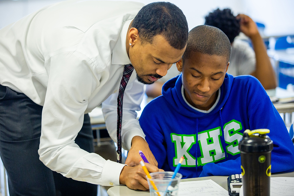 Humphrey spent one year as an apprentice teacher at KIPP, learning from the school’s top math instructor, followed by another year as a paid lead teacher in his own classroom. During that time, he worked toward his master of arts degree in teaching and learning from University College. Fully licensed, Humphrey will stay at KIPP for at least two more years. That’s great news to Nicole Niewald, co-leader at KIPP High School, for two reasons. One, Humphrey is a successful black man in a school that is nearly all-black and low-income.
