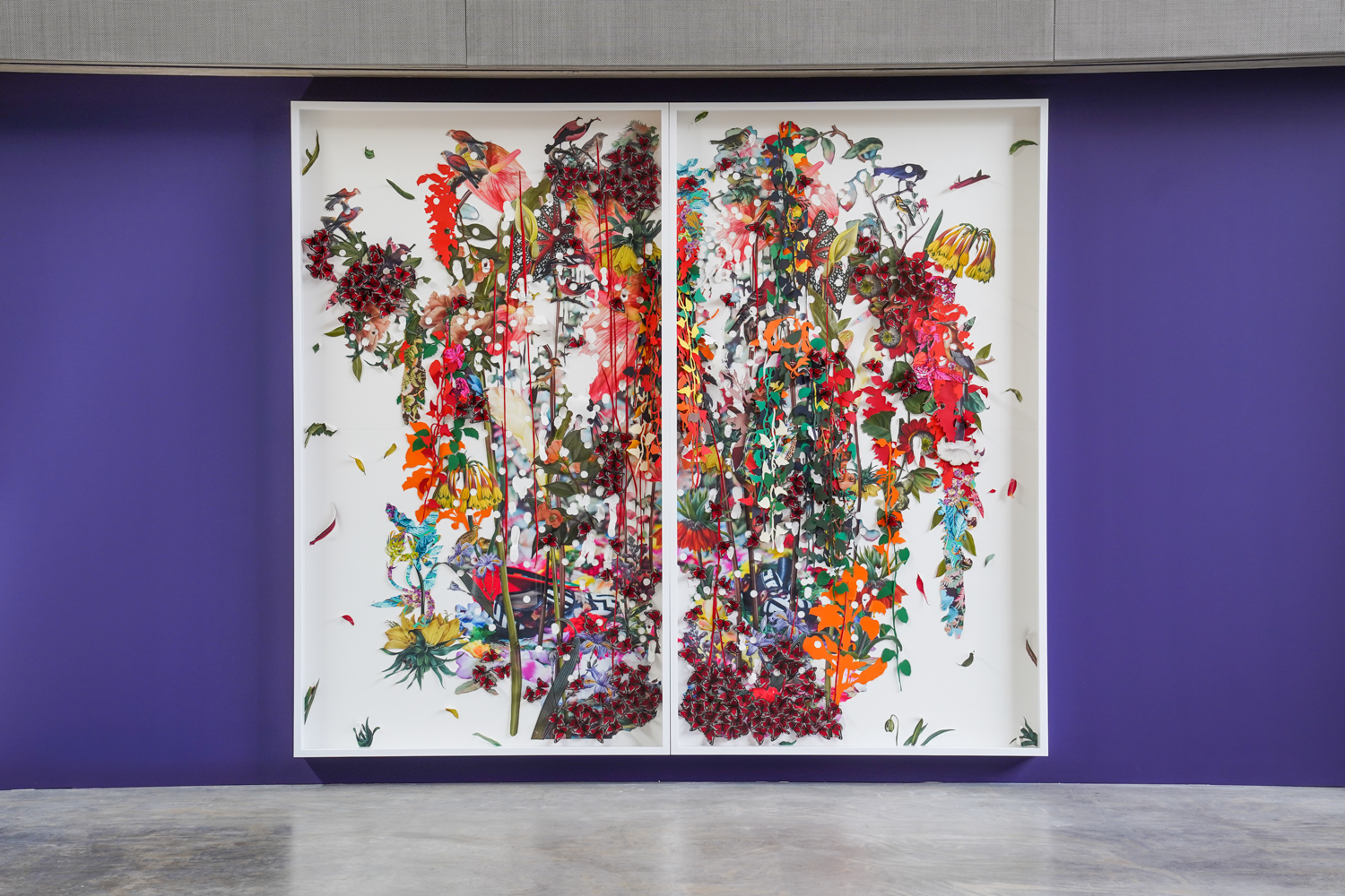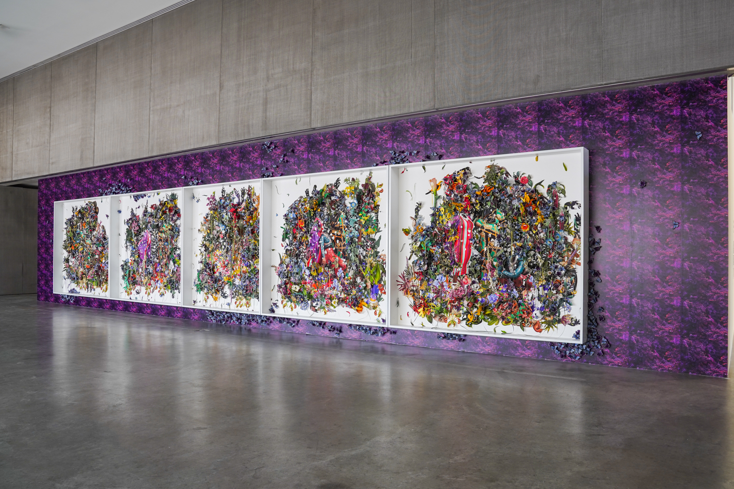 Yet beneath the flowers, weeds erupt. Three headless figures, richly dressed in spotless purples, reds and greens, enact scenes of lamentation. They raise hands to the sky. They collapse to the ground. They lean to one another in support. Small white circles riddle the tableau like bullet holes.