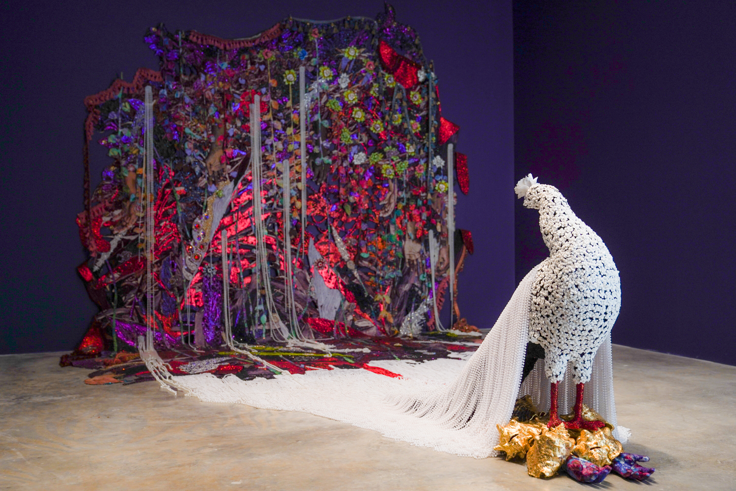 Rounding out the new exhibition is the installation “when the land is in plumage….” A spot-lit peacock emerges from a darkly glittering landscape, head twisting backward to observe its own magnificent train. White beads stream off its back like water, oozing up the walls and collapsing distinctions between figure and ground.