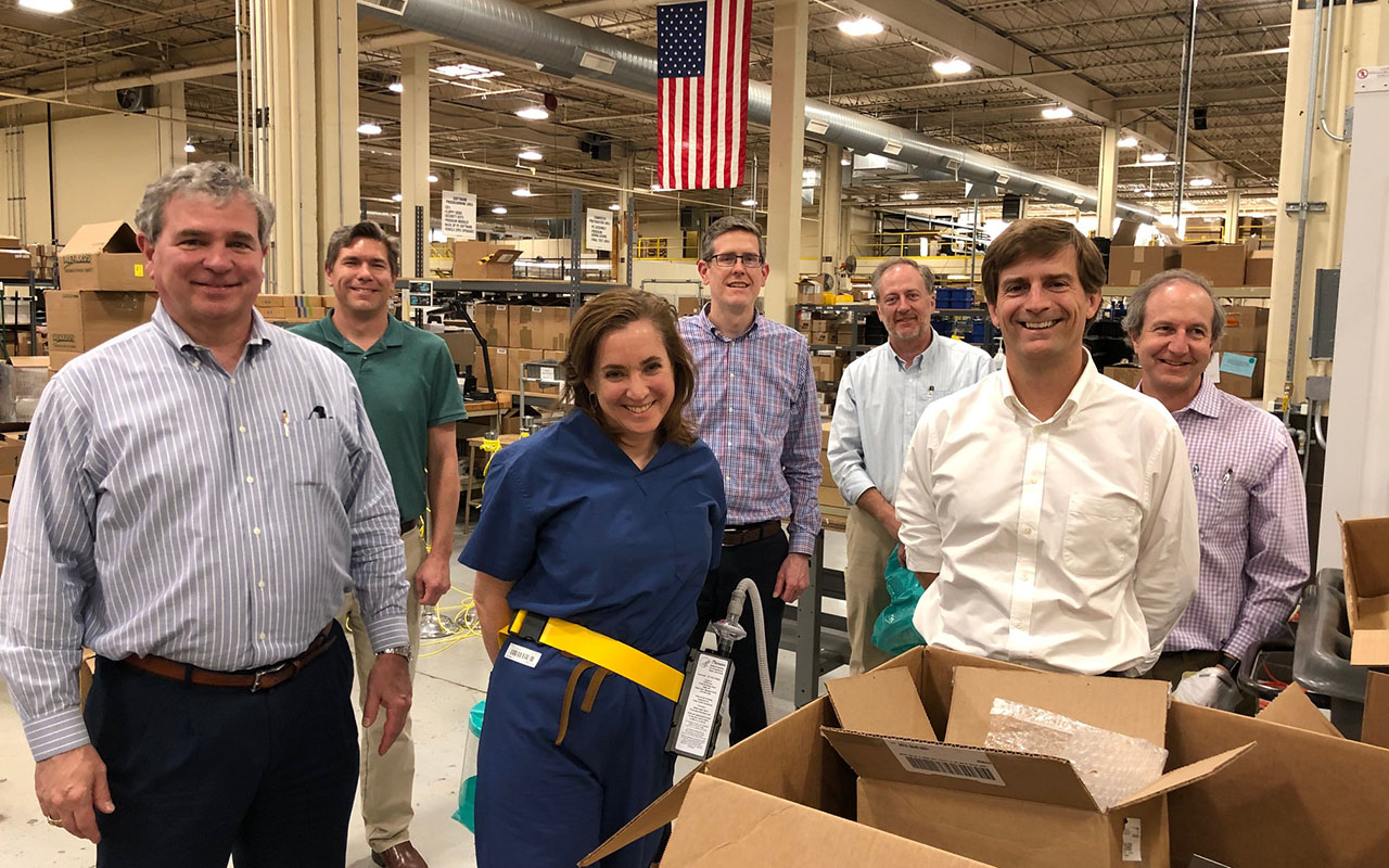 “We brought the parts back to Hunter, packaged them in a plastic box, attached the box to a belt, hooked a battery to the belt as well, and got all the fittings for the hoses to hook up,” Colarelli says. DeLaney picked up the device from Hunter Engineering and then came back the next day with pictures of an ER nurse wearing it, and said they loved it. “Then she asked: ‘When can I have 10 more?’”