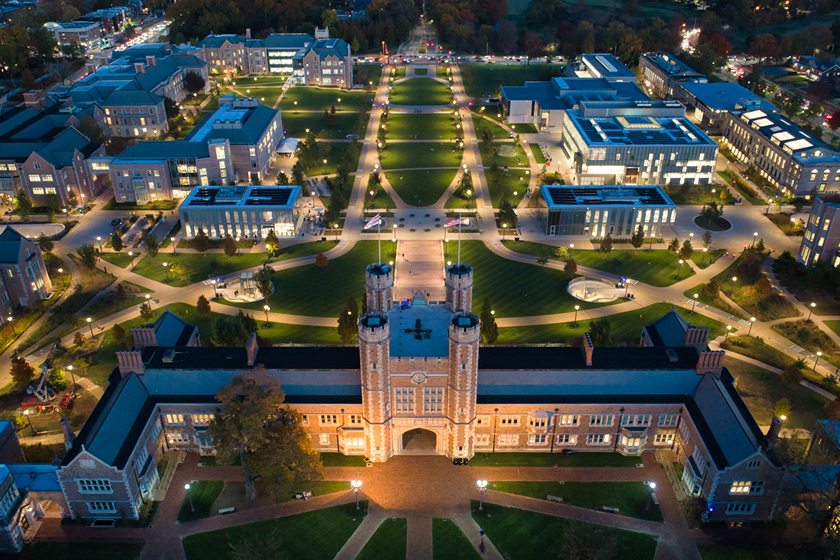 An evening aerial view of the Danforth campus of Washington University Nov. 8. (Photo: Washington University Facilities Planning & Management)