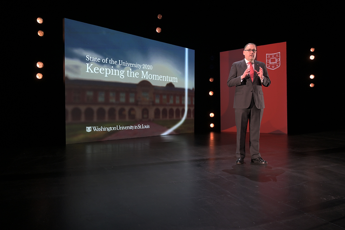 Chancellor Andrew Martin delivers the State of the University Address Jan. 27 in Edison Theatre. (Photo: James Byard/Washington University)