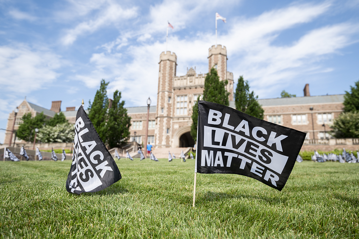 Black Lives Matter flags are installed on the Brookings Hall lawn May 25 in memory of George Floyd during the first anniversary of his death. (Photo: Danny Reise/Washington University)