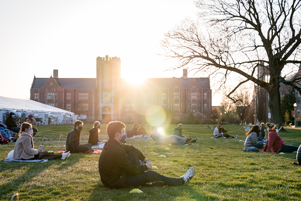 Students watch the “Covid Mysteries,” a play with a mobile stage presented by the Performing Arts Department, April 2 at Mudd Field. (Photo: Whitney Curtis/Washington University)