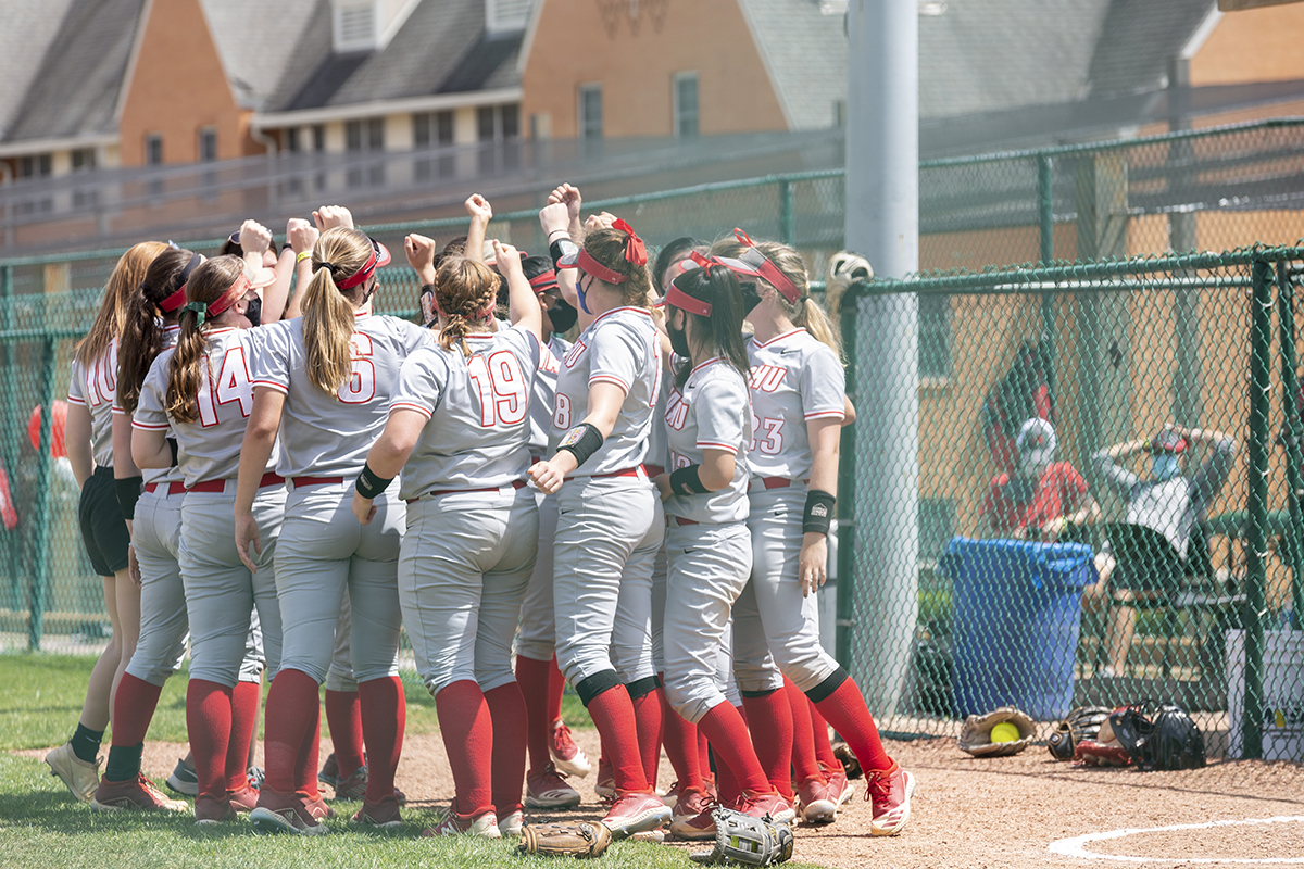The Washington University Bears softball team huddles to cheer during a game May 1 at the Athletic Complex softball field. WashU defeated the Coe College Kohawks 7-5. (Photo: Jerry Naunheim Jr./Washington University)