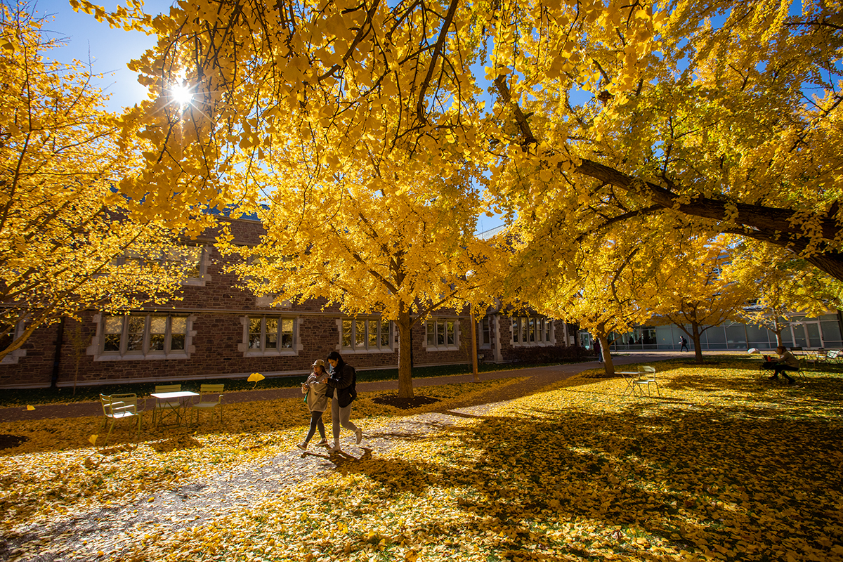 Flurries of golden leaves fall on the south side of the Gingko Walk on the Danforth Campus Nov. 18. (Photo: Joe Angeles/Washington University)