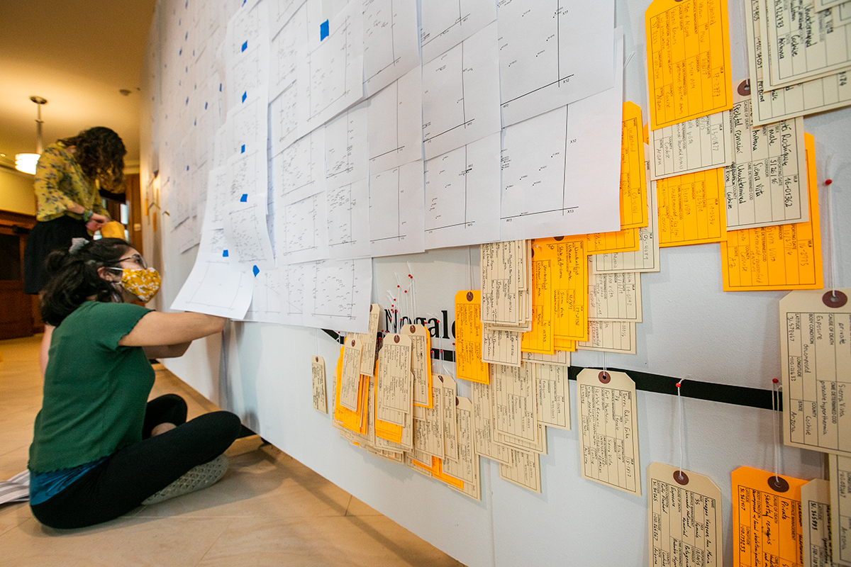 Mattie Gottbrath, of the Global Studies program, and Karina Marin, a student at the Brown School, participate in Hostile Terrain 94 on April 7 at the Danforth University Center. Hostile Terrain 94 is a participatory exhibition composed of 3,200 handwritten toe tags that represent migrants who have died in the Arizona desert between the mid-1990s and 2019. (Photo: Joe Angeles/Washington University)