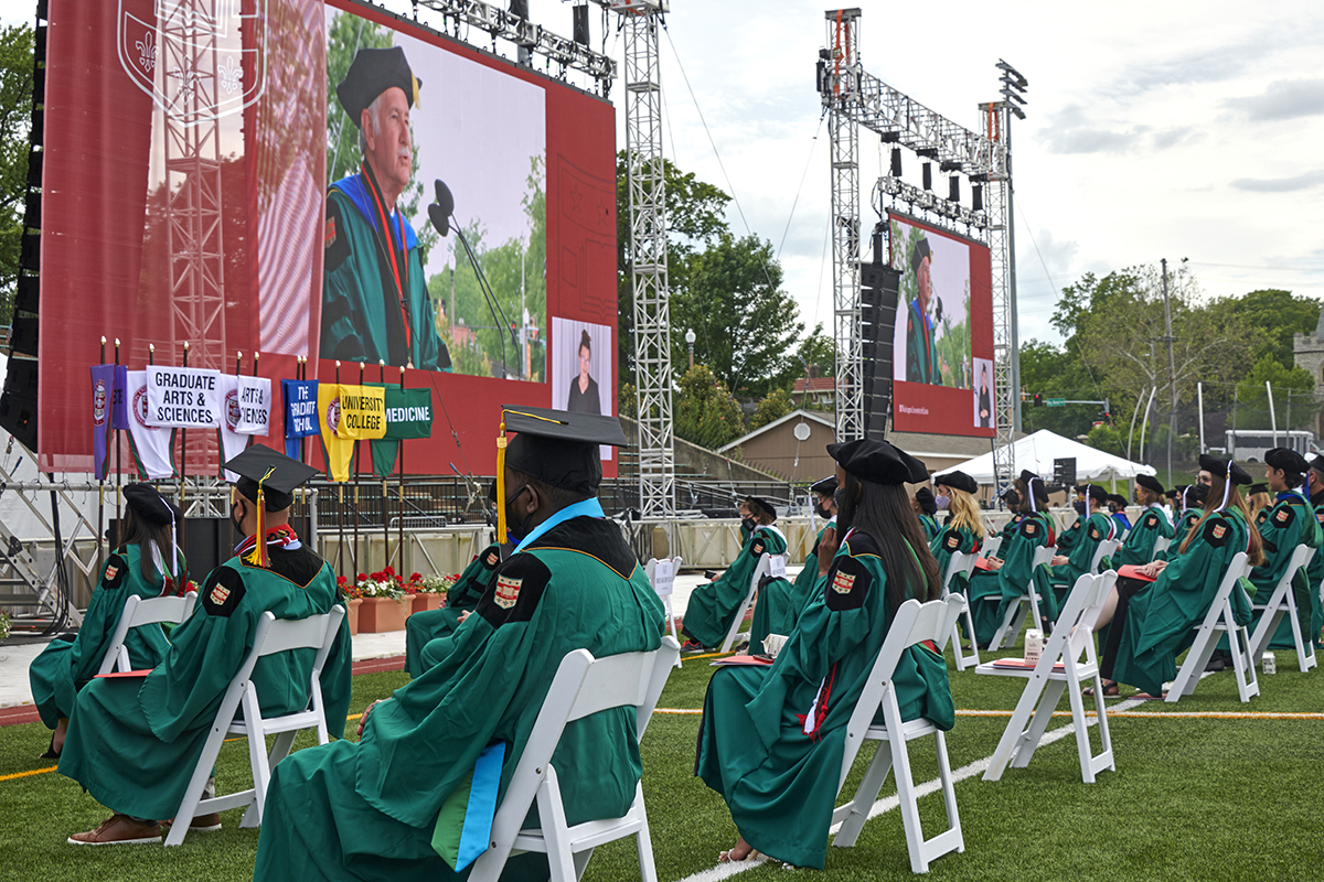 Graduates sit May 21 during the 2021 Commencement ceremony for the Graduate School and University College at Francis Olympic Field. (Photo: Mary Butkus/Washington University)