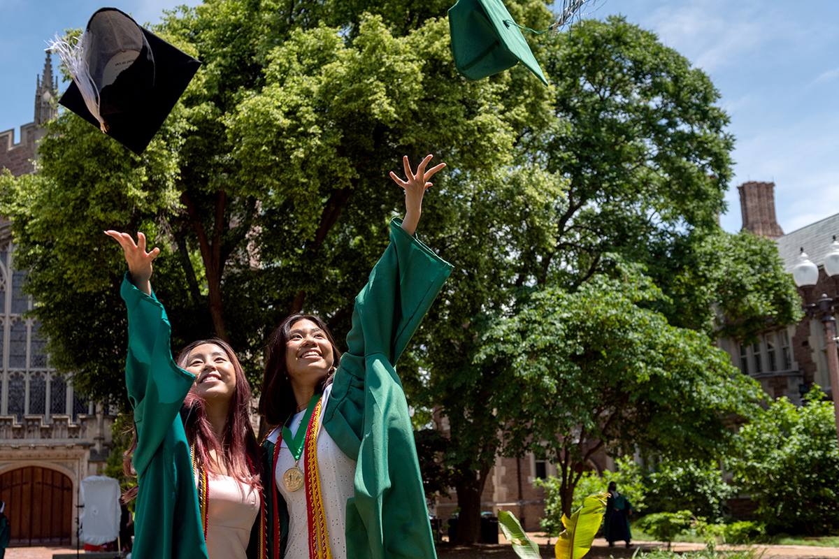 Two graduates throw their mortarboards into the air in celebration May 21 during the 2021 Commencement ceremony for Arts & Sciences at Francis Olympic Field. (Photo: Sid Hastings/Washington University)