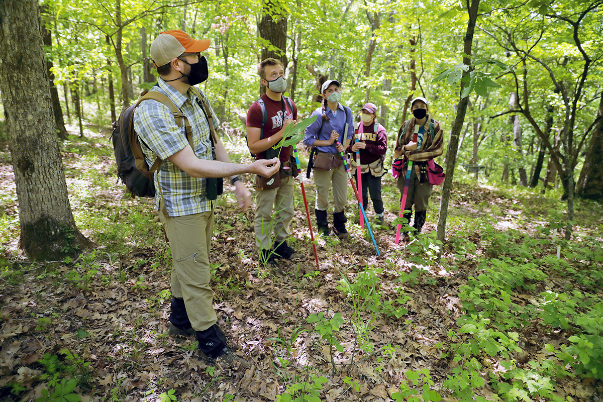 Johnathan Myers, associate professor of biology, teaches a class about microrefugia May 13 at Tyson Research Center, at the Global Earth Observatories or ForestGEO plot. (Photo: Thomas Malkowicz/Washington University)