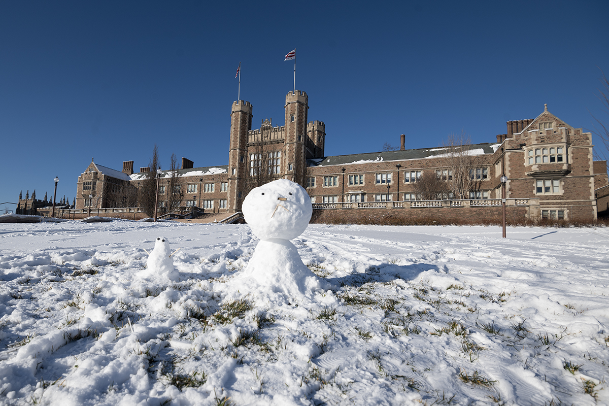 Students build small snowmen in front of Brookings Hall Jan. 28. (Photo: Danny Reise/Washington University)