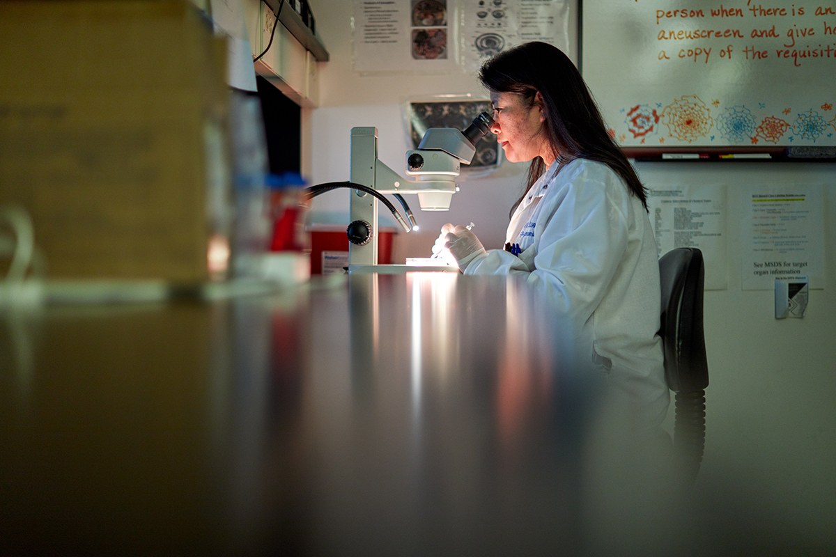 Mo Yu Kwong, technologist, examines a specimen Feb. 25 in the Cytogenomics Lab at the Pathology Department on the Medical Campus. (Photo: Matt Miller/School of Medicine)