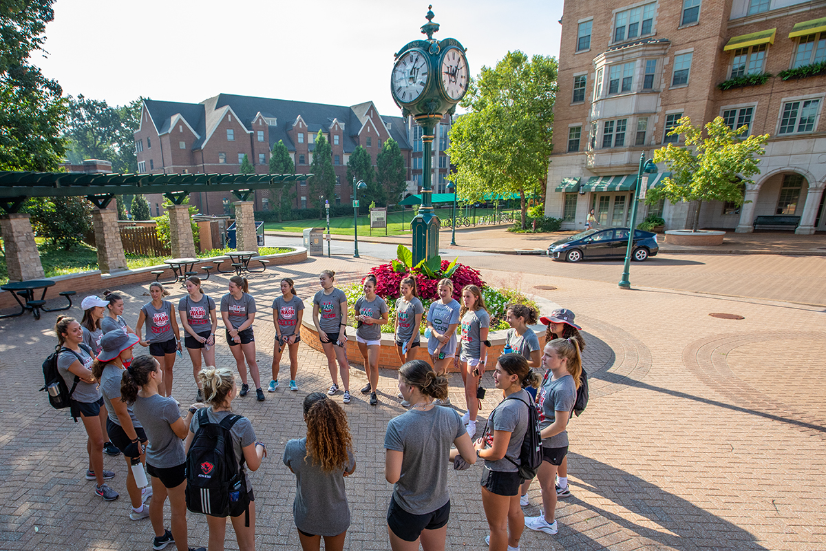 The WashU women’s soccer team gathers at the South 40 clocktower for a brief meeting Aug. 17 as students prepared to start a new academic year. (Photo: Joe Angeles/Washington University)