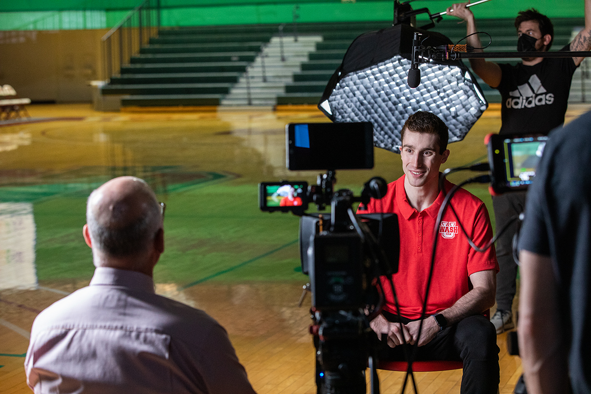 Justin Hardy, a senior on the WashU men’s basketball team, was interviewed by ESPN on Feb. 10 at the Field House about his battle with stage 4 stomach cancer. Hardy has continued to play this season while undergoing treatment. (Photo: Joe Angeles/Washington University)