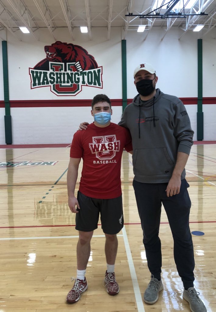 Caleb Durbin (left) and Ryan Loutos, former baseball Bears and current big leaguers, returned to the Athletic Complex to visit with old friends and teammates. Last summer, both signed deals with Major League Baseball teams; Durbin as a 14th-round draft pick to the Atlanta Braves and Loutos as an undrafted free agent to the St. Louis Cardinals. (Photo courtesy of WashU Athletics)