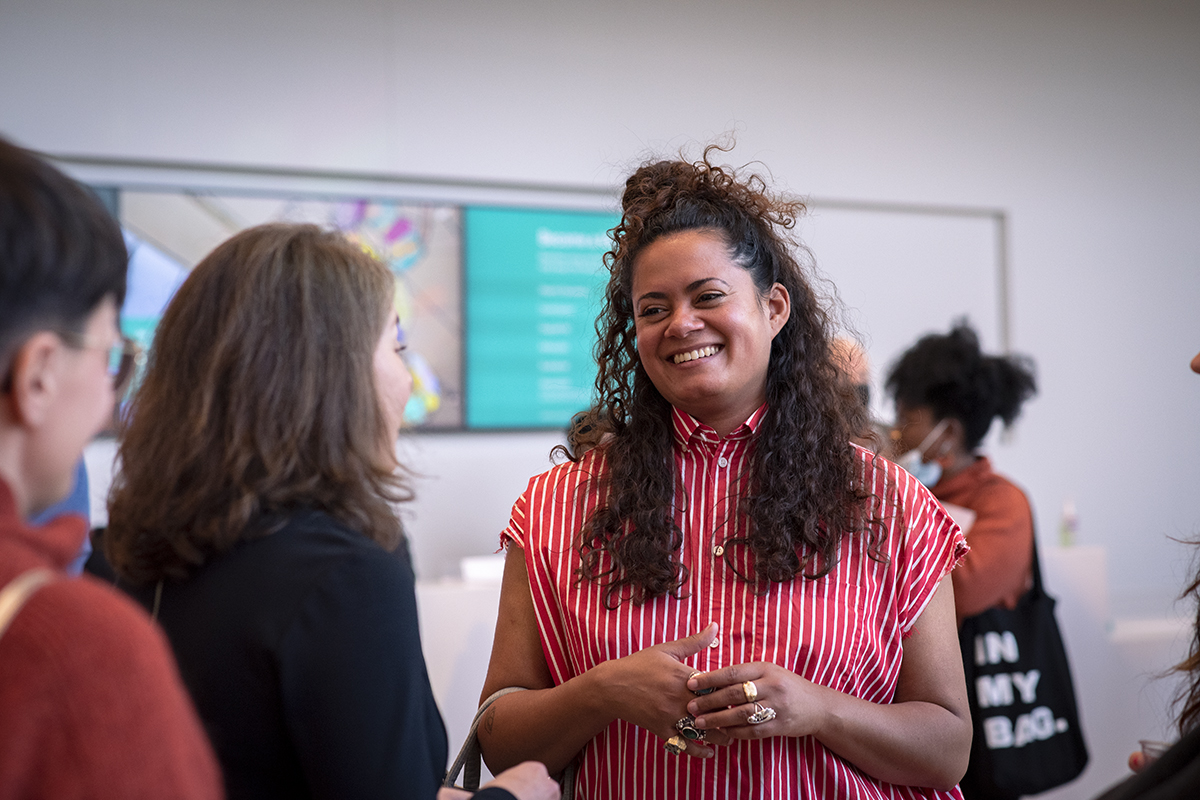 Artist Nicole Miller (right) talks with museum curator Meredith Malone at the opening of Miller’s exhibit “A Sound, A Signal, The Circus” at the Mildred Lane Kemper Art Museum. (Photo: Carol Green/Washington University)