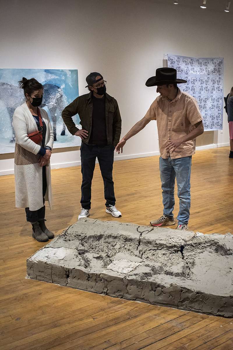 Jack Henry Whetstone (right) describes the making of his piece “Tartan Epoch” to Dryden Wells (left) and Andy Moon at the 2022 BFA Junior Studio Art Exhibition at the Des Lee Gallery. (Photo: Carol Green/Washington University)