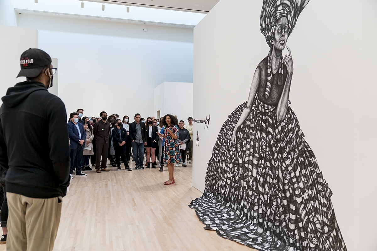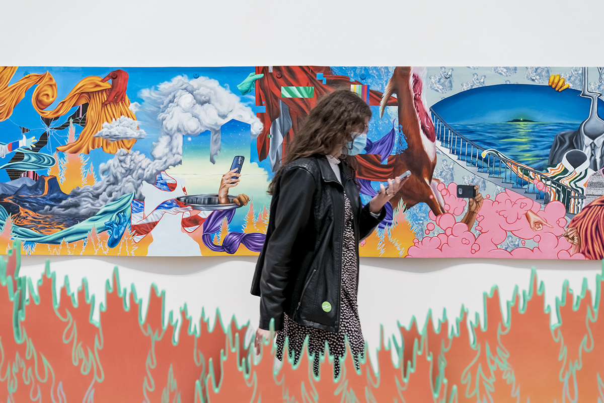 A student walks in front of MFA student Livia Xandersmith’s painting, “A Comedy of Agency, 2022,” during the MFA in Visual Art Thesis Exhibition April 9 at the Kemper Art Museum. (Photo: Whitney Curtis/Washington University)
