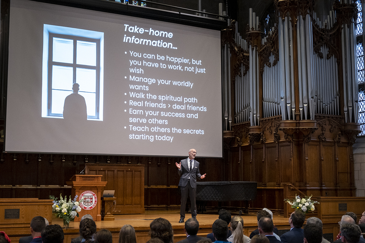 At Olin Business School’s inaugural Brauer Lecture Series event, held April 11 in Graham Chapel, bestselling author Arthur Brooks discusses finding fulfillment through work. The series aims to explore and encourage dialogue on the American free enterprise system and bring thought leaders to campus. (Photo: Sid Hastings/Washington University)